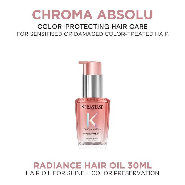 Kérastase Chroma Absolu Radiance Hair Oil is enriched with Centella Asiatica, a rare wild plant known for preserving hair color and giving it a beautiful, fragrant halo. This revamped formula provides long-lasting radiance and preserves hair color for those with color-treated hair, making it a must-have for maintaining vibrant locks.