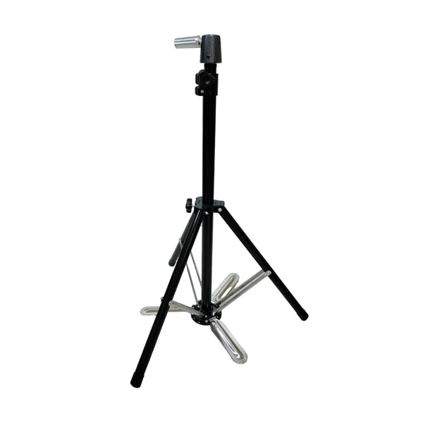 Adjustable training head tripod designed for use with mannequin heads, which are often used by hairstylists and cosmetology students for practicing hair styling and cutting techniques. This stand is specifically designed to hold a mannequin head securely and at a comfortable working height.